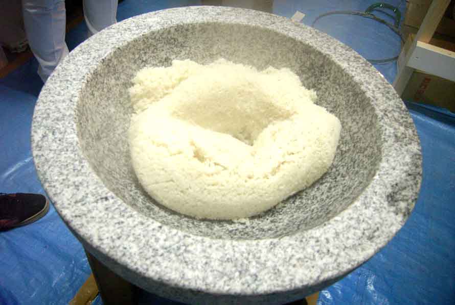 お米をふかして、ほくほくの餅米を杵に入れ、餅をつぶしてペッタンペッタン。
