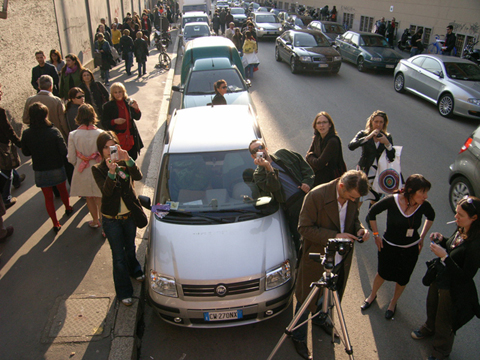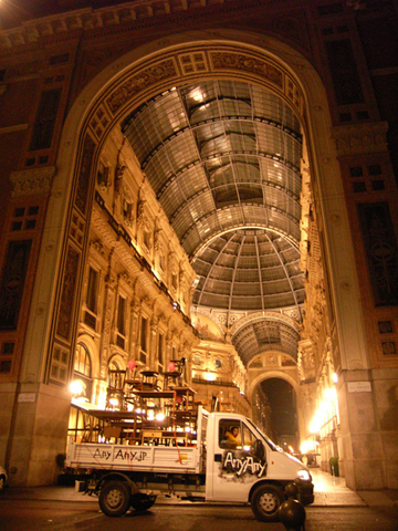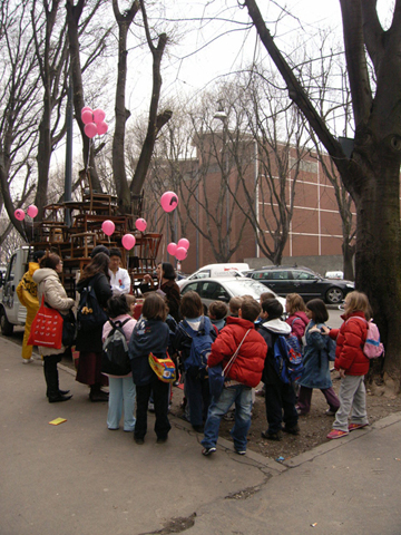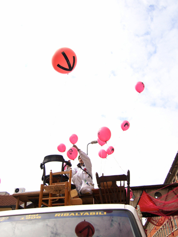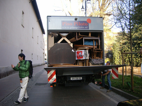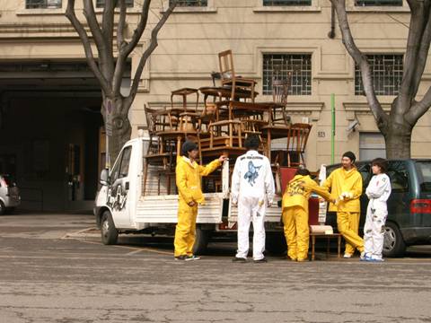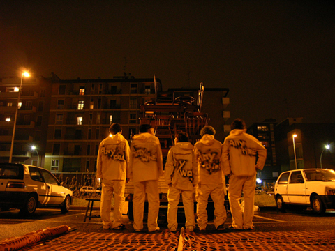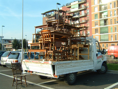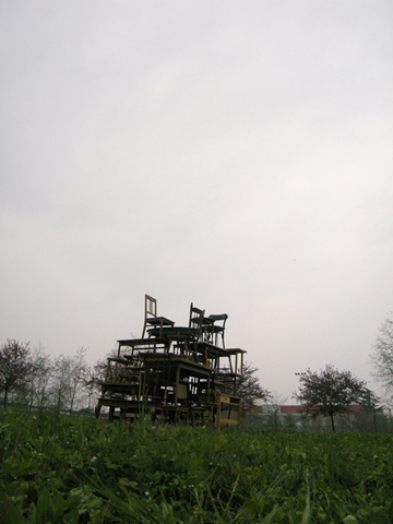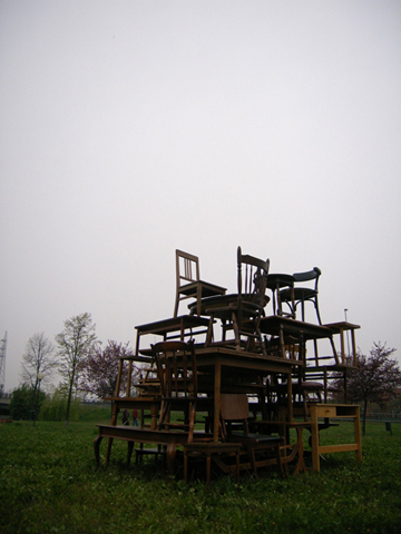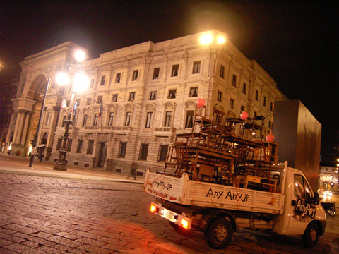 イタリアで毎年行われる世界最大規模の家具の見本市「Salone del mobile」通称ミラノサローネ。その会場に突如登場した意味不明な物体を積んだトラックと全身けばけばしいユニフォームを着た若者。なにやら物々しい雰囲気を漂わせていましたが、何を隠そうこれらすべてが今回の作品。私達の掲げたコンセプトは「AnyAny would make anything all over the world.」まあ正直むちゃくちゃです。世界中で何でもしますよなんて、、、。今回メインで制作したものは、現地で調達した大量の家具(椅子、机等)をジグザグにくみ上げてジャングルジムを構築しました。このジャングルジムの意図するものは、デザインが完成していくプロセスの中で一番重要な要素の一つ。「きっかけ」。何気ない日常の生活の一挙一動から、さまざまなトリガーを見つけそこから新たなプロダクトへと発展させる。このジャングルジムは、いわばそのコンセプトモデルです。家具とは何ぞや?とその今まで私達が家具とふれあってきた中での思い出を振り返りながら、もう一度「カグ」を再考してみる。「デザイン」をされた家具が毎年毎年無数に生まれて来る中心のミラノサローネにてこの展示会を行うことで、ここに関わる人たちへ何かしら想いを巡らせるきっかけになればというプロジェクト。